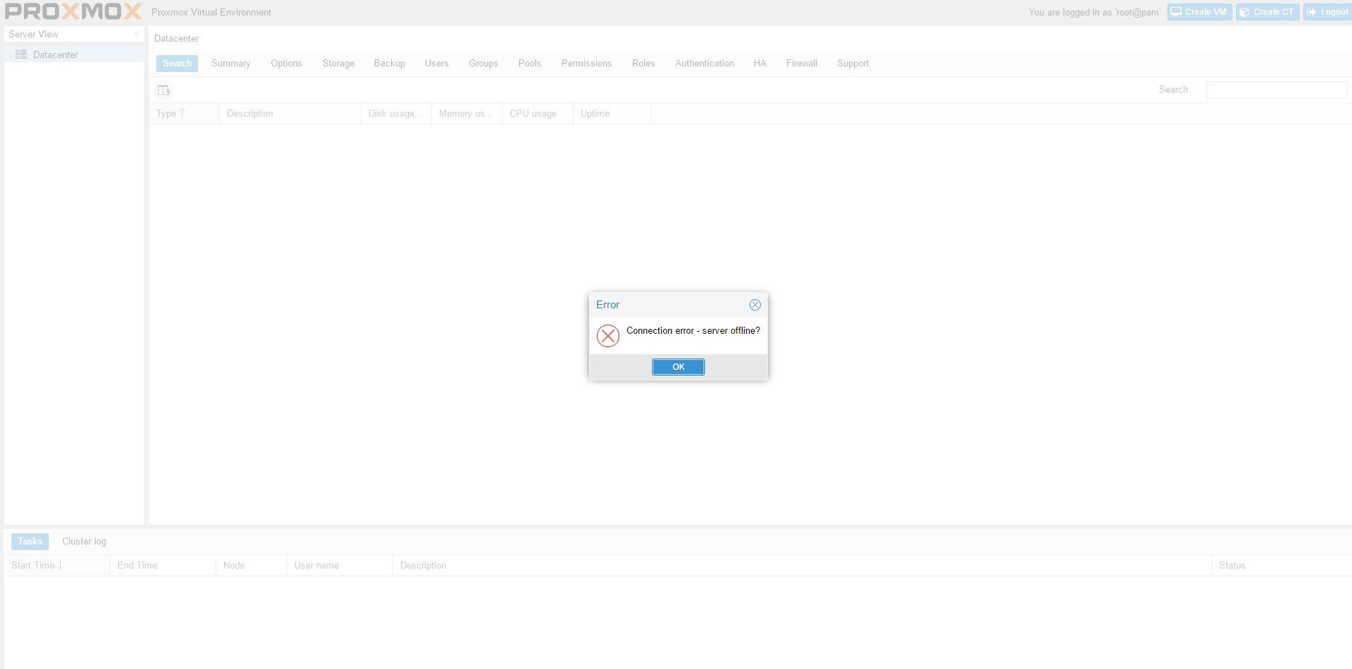 But when i now connect to the gui, it comes the error Connection error - server offline? and the gui is empty, so i have no server there.
